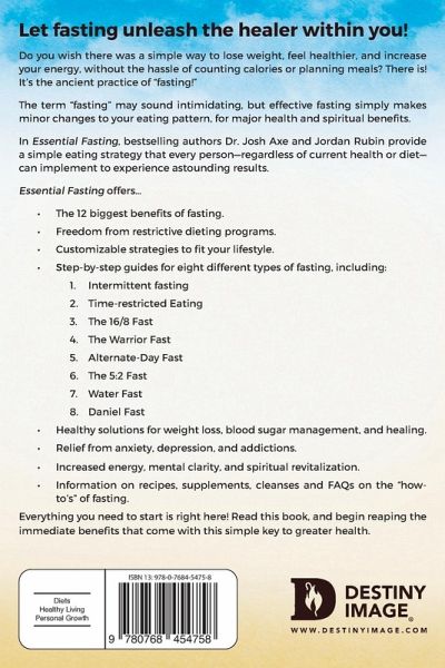 Let fasting unleash the healer within you! Do you wish there was a simple way to lose weight, feel healthier, and increase your energy, without the hassle of counting calories or planning meals? There is! It’s the ancient practice of "fasting!" The term "fasting" may sound intimidating, but effective fasting simply makes minor changes to your eating pattern, for major health and spiritual benefits. In Essential Fasting, bestselling authors Dr. Josh Axe and Jordan Rubin provide a simple eating strategy that every person—regardless of current health or diet—can implement to experience astounding results. Essential Fasting offers… The 12 biggest benefits of fasting. Freedom from restrictive dieting programs. Customizable strategies to fit your lifestyle. Step-by-step guides for eight different types of fasting, including: Intermittent fasting Time-restricted Eating The 16/8 Fast The Warrior Fast Alternate-Day Fast The 5:2 Fast Water Fast Daniel Fast Healthy solutions for weight loss, blood sugar management, and healing. Relief from anxiety, depression, and addictions. Increased energy, mental clarity, and spiritual revitalization. Information on recipes, supplements, cleanses and FAQs on the "how-to’s" of fasting. Everything you need to start is right here! Read this book, and begin reaping the immediate benefits that come with this simple key to greater health.