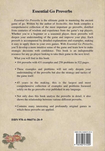 Essential Go Proverbs is the ultimate guide to mastering the ancient game of go. Written by the author of Invincible, this book compiles a comprehensive collection of the most important go proverbs, distilled from centuries of wisdom and experience from the game's top players. Whether you're a beginner or a seasoned player, these proverbs will deepen your understanding of the game and improve your play. Each proverb is accompanied by detailed explanations and examples, making it easy to apply them to your own games. With Essential Go Proverbs, you'll develop a more intuitive sense of the game and learn how to make strategic decisions with confidence. This book is an indispensable resource for any go player looking to take their game to the next level. What you will find in this book: * 104 proverbs with 431 examples and 258 problems in 522 pages. * These examples and problems will not only deepen your understanding of the proverbs but also the strategy and tactics of the game itself. * 45 years in the making, this is the largest and most comprehensive collection of examples and problems focussed solely on the go proverbs ever published in any language. * Not only does this book analyze the proverbs in detail, it also shows the relationship between one proverb to others. * Contains many interesting and profoundly original games in which these proverbs were applied.