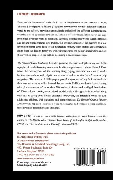 In The Essential Guide to Mummy Literature, Brian J. Frost provides the first in-depth survey and bibliography of works of fiction featuring mummies.