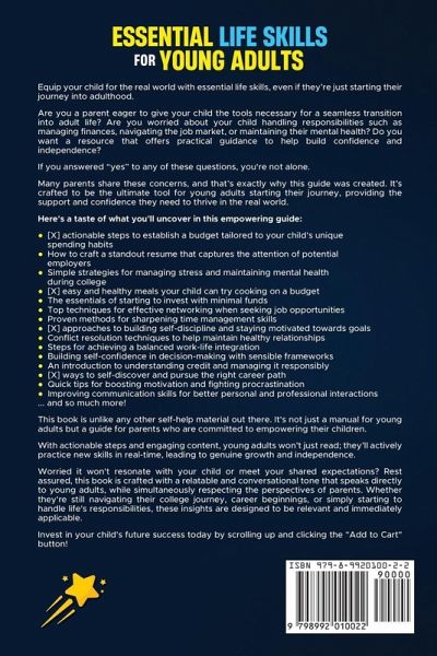 Equip your child for the real world with essential life skills, even if they're just starting their journey into adulthood. Are you a parent eager to give your child the tools necessary for a seamless transition into adult life? Are you worried about your child handling responsibilities such as managing finances, navigating the job market, or maintaining their mental health? Do you want a resource that offers practical guidance to help build confidence and independence? If you answered "yes" to any of these questions, you're not alone. Many parents share these concerns, and that's exactly why this guide was created. It's crafted to be the ultimate tool for young adults starting their journey, providing the support and confidence they need to thrive in the real world. Here's a taste of what you'll uncover in this empowering guide: * Steps to establish a budget tailored to your child's unique spending habits * How to craft a standout resume that captures the attention of potential employers * Simple strategies for managing stress and maintaining mental health during college Easy and healthy meals your child can try cooking on a budget * The essentials of starting to invest with minimal funds * Top techniques for effective networking when seeking job opportunities * Proven methods for sharpening time management skills * Approaches to building self-discipline and staying motivated towards goals * Conflict resolution techniques to help maintain healthy relationships * Steps for achieving a balanced work-life integration * Building self-confidence in decision-making with sensible frameworks ...and so much more! This book is unlike any other self-help material out there. Invest in your child's future success today.