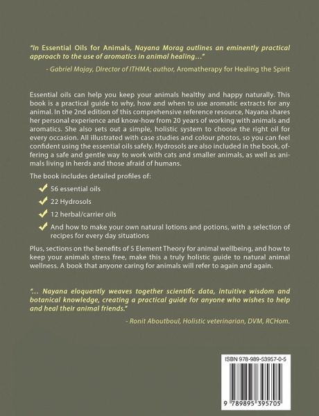 This book is a practical guide to why, how and when to use aromatic extracts for any animal. In the 2nd edition of this comprehensive reference resource, Nayana shares her personal experience and know-how from 20 years of working with animals and aromatics. She also sets out a simple, holistic system to choose the right oil for every occasion. All illustrated with case studies and colour photos, so you can feel confident using the essential oils safely. Hydrosols are also included in the book, offering a safe and gentle way to work with cats and smaller animals, as well as animals living in herds and those afraid of humans. The book includes detailed profiles of: 56 essential oils 22 Hydrosols 12 herbal/carrier oils And how to make your own natural lotions and potions, with a selection of recipes for every day situations Plus, sections on the benefits of 5 Element Theory for animal wellbeing, and how to keep your animals stress free, make this a truly holistic guide to natural animal wellness. A book that anyone caring for animals will refer to again and again.