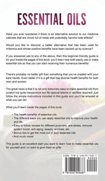 If you answered yes to any of the above, then this beginner friendly guide is for you! Inside the pages of this book, you'll learn how both easily use or make essential oils so that you can start receiving their numerous benefits! How difficult is it make essential oils from scratch? There's probably no better gift than something that you've created with your bare hands. Even better if it is a gift that has diverse health benefits for both men and women. The great news is that it is not only extremely easy to make essential oils from scratch but quite inexpensive too! No special talents or abilities required! Just follow the simple instructions included in this guide and you'll be amazed at what you can do! What you'll learn inside the pages of this book: The health benefits of essential oils. The different ways you can apply essential oils to improve your health and life. Easy to follow recipes for different purposes: anti-stress, immune system boost, anti-aging, beauty, wrinkles, etc. Bonus tips to get the most out of your essential oils. And much more!