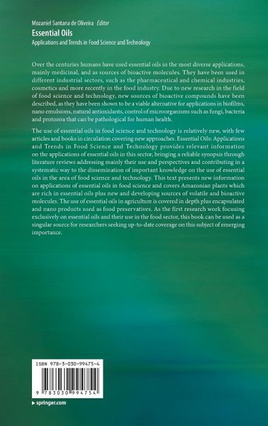The use of essential oils in food science and technology is relatively new, with few articles and books in circulation covering new approaches. Essential Oils: Applications and Trends in Food Science and Technology provides relevant information on the applications of essential oils in this sector, bringing a reliable synopsis through literature reviews addressing mainly their use and perspectives and contributing in a systematic way to the dissemination of important knowledge on the use of essential oils in the area of food science and technology. This text presents new information on applications of essential oils in food science and covers Amazonian plants which are rich in essential oils plus new and developing sources of volatile and bioactive molecules. The use of essential oils in agriculture is covered in depth plus encapsulated and nano products used as food preservatives. As the first research work focusing exclusively on essential oils and their use in the food sector, this book can be used as a singular source for researchers seeking up-to-date coverage on this subject of emerging importance.