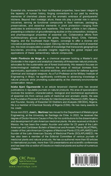 Valdir Florêncio da Veiga Jr., a chemical engineer holding a Master's and Doctorate in the organic and analytical chemistry of Amazonian natural products, advocates for the sustainable use of forest biodiversity. His research focuses on biotechnological methods to enhance the value of residual biomass from agroindustry, applicable in industrial additives, and solutions for defense against chemical and biological weapons. As a Full Professor at the Military Institute of Engineering in Brazil, he significantly contributes to advancing knowledge in natural products while promoting sustainability at the chemistry-environmental conservation nexus. Isiaka Ajani Ogunwande is an astute terpenoid chemist who has several publications in reputable journals on natural products. His area of specialization involves the isolation, characterization, biological and biochemical applications of essential oils from various parts of medicinal and aromatic plants. He was the Foundation President of Society for Interdisciplinary Research (SIR), Nigeria, and Founder, Society of Essential Oil Distillers and Analysts (SEODA), Nigeria. He is a member of Chemical Society of Nigeria (CSN). He has many awards to his credit. Since mid-2023, José L. Martinez has moved to the Department of Metallurgical Engineering, at the University de Santiago de Chile. In 2022, he received the degree of Doctor Honoris Causa in Peru for his contributions to the dissemination and development of Latin American medicinal plants. He also received a tribute in Mexico. He has been the creator, founder and editor for 23 years of the Latin American and Caribbean Bulletin of Medicinal and Aromatic Plants (BLACPMA), creator of the Latin American Congress of Medicinal Plants (COLAPLAMED) and founder of the Latin American Society of Medicinal Plants (SOLAPLAMED). He has also been a member of the Editorial Committee of various journals of medicinal plants and natural products. He has co-authored more than 60 articles in international journals, more than 120 presentations and scientific conferences and has been the co-editor of 5 books on medicinal plants and author of numerous chapters.