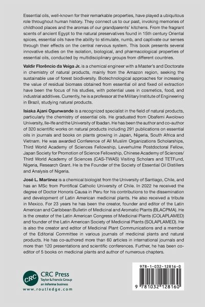 Valdir Florêncio da Veiga Jr. is a chemical engineer with a Master's and Doctorate in chemistry of natural products, mainly from the Amazon region, seeking the sustainable use of forest biodiversity. Biotechnological approaches for increasing the value of residual biomass obtained from essential oil and fixed oil extraction have been the focus of his studies, with potential uses in cosmetics, food, and industrial additives. Currently, he is a professor at the Military Institute of Engineering in Brazil, studying natural products. Isiaka Ajani Ogunwande is a recognized specialist in the field of natural products, particularly the chemistry of essential oils. He graduated from Obafemi Awolowo University, Ile-Ife and the University of Ibadan. He has been the author and co-authors of 320 scientific works on natural products including 291 publications on essential oils in journals and books on plants growing in Japan, Nigeria, South Africa and Vietnam. He was awarded Conference of All Muslim Organizations Scholarships, Third World Academy of Sciences Fellowship, Leverhulme Postdoctoral Fellow, Japan Society for Promotion of Science Fellowship, Chinese Academy of Sciences/Third World Academy of Sciences (CAS-TWAS) Visiting Scholars and TETFund, Nigeria, Research Grant. He is the Founder, Society of Essential Oil Distillers and Analysis of Nigeria. José L. Martinez is a chemical biologist from the University of Santiago of Chile, MSc from Pontifical Catholic University of Chile. In 2022 he received the degree of Doctor Honoris Causa in Peru for his contributions to the dissemination and development of Latin American medicinal plants. He also received a tribute in Mexico. He has been the creator, founder and editor since 23 years of the Latin American and Caribbean Bulletin of Medicinal and Aromatic Plants (BLACPMA), creator of the Latin American Congress of Medicinal Plants (COLAPLAMED) which is in its eleventh version and also founder of the Latin American Society of Medicinal Plants (SOLAPLAMED). He is also the creator and editor of Medicinal Plant Communications along with being a member of the Editorial Committee in various journal of medicinal plants and natural products. He has co-authored more than 60 articles in international journals, more than 120 presentations and scientific conferences. Further, he has been co-editor of 5 books on medicinal plants and author of numerous chapters.