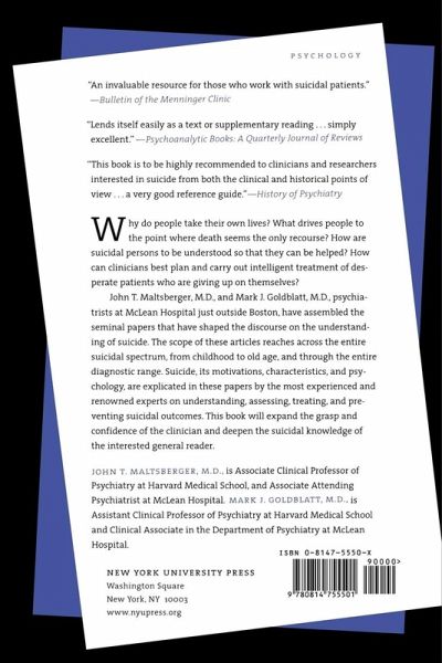 An exploration of the motivations, characteristics, and psychology of suicide Why do people take their own lives? How can clinicians best plan and carry out intelligent treatment of desperate patients who are giving up on themselves? Suicide, its motivations, characteristics, and psychology are explicated in these papers by the most experienced and renowned experts on the subject. A definitive volume, Essential Papers on Suicide features the work of Ernest Jones; Kate Friedlander; George Murphy, R. H. Wilkinson, S. Gassner, and J. Kayes; Joseph C. Sabbath; Robert E. Litman; Milton Rosenbaum; Charles Swearingen; Avery D. Weisman; Mervin Glasser, Egl Laufer, Moses Laufer and Myer Wohl; Donald A. Schwartz, Don E. Flinn and Paul F. Slawson; Aaron T. Beck, Maria Kovacs and Arlene Weissman; Marie sberg, Lil Traskman and Peter Thoren; Stuart Asch; John T. Maltsberger; Alex D. Pokorny; Erna Furman; Cynthia R. Pfeffer, Robert Plutchik, Mark S. Mizruchi and Robert Lipkins; Myrna M. Weissman, Gerald L. Klerman, Jeffrey S. Markowitz and R. Oullette; Jan Fawcett, William A. Scheftner, Louis Fogg, David C. Clark, Michael A. Young, Don Hedeker, and Robert Gibbons, among others.