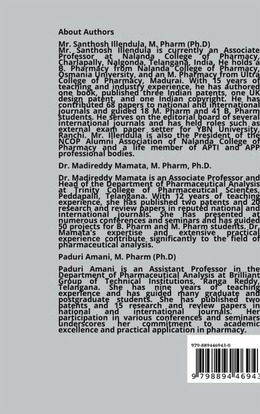 Essential Pharmaceutical Analysis: As per PCI 1st B. Pharmacy Syllabus offers a comprehensive guide tailored specifically for first-year B. Pharmacy students. Authored by renowned experts Mr. Santhosh Illendula, M. Pharm (Ph.D), Dr. Madireddy Mamata, M. Pharm, Ph.D., and Paduri Amani, M. Pharm (Ph.D), this book addresses the critical need for a consolidated and accessible resource in pharmaceutical analysis. Students will benefit from: Detailed Explanations: Comprehensive coverage of each topic with clear, concise explanations to enhance understanding. Practical Applications: Step-by-step procedures for the preparation and standardization of solutions, ensuring students gain practical laboratory skills. In-depth Theoretical Insights: Exploration of the theories behind acid-base titrations, redox titrations, and electrochemical methods, making complex concepts more digestible. Error Analysis and Management: Insights into sources of errors, types of errors, and methods to minimize errors, with a focus on accuracy and precision. Pharmacopoeia and Impurity Testing: Detailed sections on the role of pharmacopoeias, sources of impurities in medicinal agents, and limit tests for common impurities.