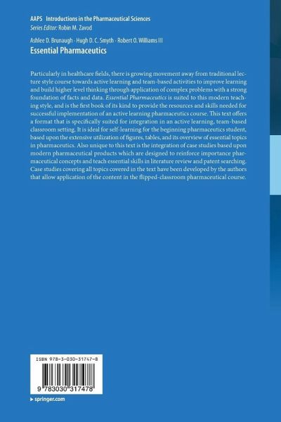 Particularly in healthcare fields, there is growing movement away from traditional lecture style course towards active learning and team-based activities to improve learning and build higher level thinking through application of complex problems with a strong foundation of facts and data. Essential Pharmaceutics is suited to this modern teaching style, and is the first book of its kind to provide the resources and skills needed for successful implementation of an active learning pharmaceutics course.This text offers a format that is specifically suited for integration in an active learning, team-based classroom setting. It is ideal for self-learning for the beginning pharmaceutics student, based upon the extensive utilization of figures, tables, and its overview of essential topics in pharmaceutics. Also unique to this text is the integration of case studies based upon modern pharmaceutical products which are designed to reinforce importance pharmaceutical concepts and teachessential skills in literature review and patent searching. Case studies covering all topics covered in the text have been developed by the authors that allow application of the content in the flipped-classroom pharmaceutical course.