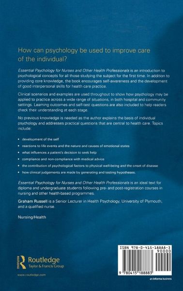 This text examines the concepts which are fundamental to everyday nursing practice. Understanding how individuals function psychologically in health and illness is vital to providing appropriate care for all patients and clients. Assuming no previous knowledge of the subject, the author explores the basis of individual psychology focusing on personality traits, beliefs systems, body-image and self-esteem. Periods of illness are seen as psychologically demanding events which individuals cope with in different ways. The book considers how we recognize and interpret the signs and symptoms of illness in ourselves, what influences the decision to seek help and whether or not we comply with advice from health professionals. The contribution of psychological factors to physical wellbeing is also examined and the link between psychological theory and patient care is examined throughout the book. With scenarios and questions to help the reader apply the concepts to nursing practice Essential Psychology for Nurses provides an excellent introduction to the subject for pre-registration students and those studying psychological concepts in relation to health care.