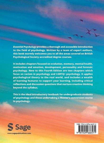 Essential Psychology provides a thorough and accessible introduction to the field of psychology. Written by a team of expert authors, this book warmly welcomes you to all the areas covered on British Psychological Society accredited degree courses. It includes chapters focused on evolution, memory, thinking and reasoning, motivation and emotion, development, and personality. New to this Fourth Edition are two chapters which focus on racism in psychology and LGBTQ+ psychology. It applies psychological theory to the real world, and includes a wealth of learning features to support your learning, including critical reflections and discussion questions that nurture creative thinking beyond the syllabus. This is the ideal introductory textbook for undergraduate students of psychology and those undertaking a Master¿s conversion course in psychology.