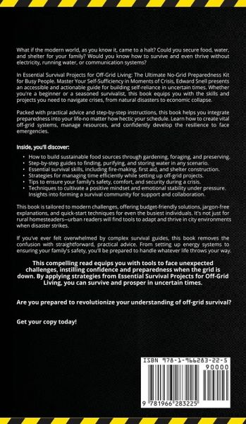 Essential Survival Projects for Off-Grid Living: Master Self-Sufficiency and Thrive in Any Crisis What if the modern world, as you know it, came to a halt? Could you secure food, water, and shelter for your family? Would you know how to survive and even thrive without electricity, running water, or communication systems? In Essential Survival Projects for Off-Grid Living: The Ultimate No-Grid Preparedness Kit for Busy People. Master Your Self-Sufficiency in Moments of Crisis, Edward Snell presents an accessible and actionable guide for building self-reliance in uncertain times. Whether you're a beginner or a seasoned survivalist, this book equips you with the skills and projects you need to navigate crises, from natural disasters to economic collapse. Packed with practical advice and step-by-step instructions, this book helps you integrate preparedness into your life-no matter how hectic your schedule. Learn how to create vital off-grid systems, manage resources, and confidently develop the resilience to face emergencies. Inside, you'll discover:How to build sustainable food sources through gardening, foraging, and preserving. Step-by-step guides to finding, purifying, and storing water in any scenario. Essential survival skills, including fire-making, first aid, and shelter construction. Strategies for managing time efficiently while setting up off-grid projects. Tips to ensure your family's safety, comfort, and security during a crisis. Techniques to cultivate a positive mindset and emotional stability under pressure. Insights into forming a survival community for support and collaboration. This book is tailored to modern challenges, offering budget-friendly solutions, jargon-free explanations, and quick-start techniques for even the busiest individuals. It's not just for rural homesteaders-urban readers will find tools to adapt and thrive in city environments when disaster strikes. If you've ever felt overwhelmed by complex survival guides, this book removes the confusion with straightforward, practical advice. From setting up energy systems to ensuring your family's safety, you'll be prepared to handle whatever life throws your way. This compelling read equips you with tools to face unexpected challenges, instilling confidence and preparedness when the grid is down. By applying strategies from Essential Survival Projects for Off-Grid Living, you can survive and prosper in uncertain times. Are you prepared to revolutionize your understanding of off-grid survival? Get your copy today!