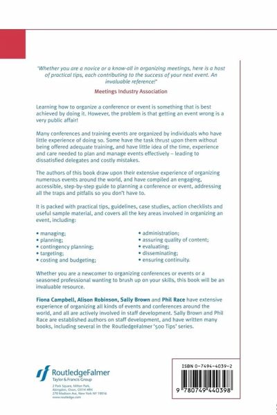 Many conferences and training events are organised by individuals who have little experience of doing so. Some have had the task thrust upon them without being offered adequate training, and have little idea of the time, experience and care needed to plan and manage events effectively. Each conference is different, and each can present a new problem to the unprepared, even to the most experienced conference organiser. This book provides immediate, accessible advice on how to run an effective event, featuring a wealth of practical tips, guidelines, case studies, action checklists, and useful sample material and templates. All areas of organisation are covered, including: managing, planning, contingency planning, targeting, costing and budgeting, housekeeping, administering, assuring the quality of content, evaluating, disseminating and ensuring continuity.