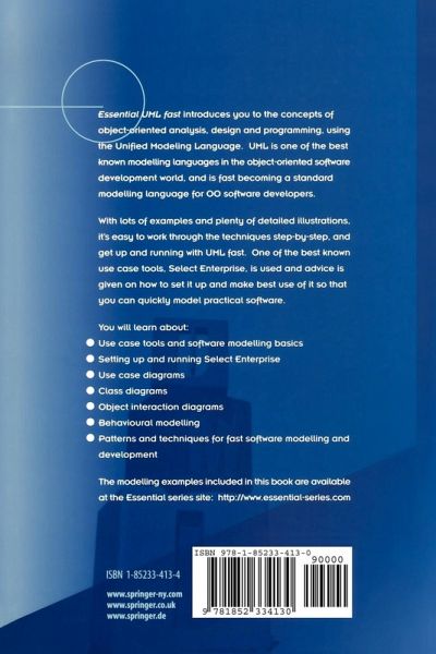 Essential UML fast introduces the concepts of object-oriented analysis, design and programming, using the Unified Modeling Language (UML). UML is one of the best known modeling languages in the object-oriented software development world, and is fast becoming a standard amongst OO software developers. The book contains plenty of examples and detailed illustrations, making it easy for readers to get up and running with UML fast. In providing these examples the author relies on one of the well known use case tools, Select Enterprise. Advice is given on how to set up Select Enterprise as well as how to use it to speed up the modeling process of practical software.