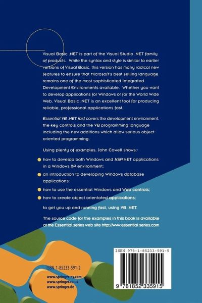 Visual Basic .NET is part of the Visual Studio .NET family of products. While the syntax and style are similar to earlier versions of Visual Basic, this version has many radical new features to ensure that Microsoft's best selling language remains one of the most sophisticated Integrated Development Environments available. Whether you want to develop applications for Windows or for the World Wide Web, Visual Basic .NET is an excellent tool for producing reliable, professional applications fast. Essential VB .NET fast covers the development environment, the key controls and the VB programming language including the new additions which allow serious object-oriented programming. Using plenty of examples, John Cowell shows: - How to develop both Windows and ASP .NET applications in a Windows XP environment - An introduction to developing Windows database applications - How to use the essential Windows and Web controls - How to create object orientate d applications to get you up and running fast, using VB.
