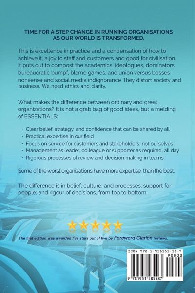 Time for a step change in running organisations as our world is transformed. This is excellence in practice and a condensation of how to achieve it, a joy to staff ad customers and good for civilization. It puts out to compost the academics, ideologues, dominators, bureaucratic bumpf, blame games, and union versus bosses nonsense and social media indignorance that distort society. We need ethics and clarity. What makes the difference between ordinary and great organisations? It is not a grab bag of good ideas, but a melding of ESSENTIALS: Clear belief, strategy, and confidence that ca be shared by all Practical expertise in our field Focus o service for customers and stakeholders, not ourselves Management as leader, colleague or supporter as required, all day Rigorous processes of review and decision making in teams. Some of the worst organisations have more expertise than the best. The difference is in belief, culture, and processes; support for people; and rigour of decisions, form top to bottom.
