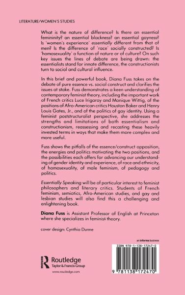 In this brief and powerful book, Diana Fuss takes on the debate of pure essence versus social construct, engaging with the work of Luce Irigaray and Monique Wittig, Henry Louis Gates, Jr. and Houston Baker, and with the politics of gay identity.