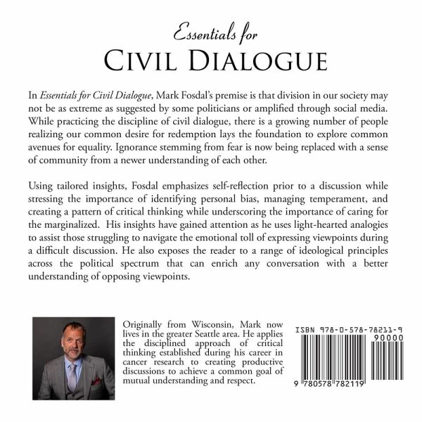 During turbulent times, many feel frustrated or inadequate when communicating personal opinions about current events or policies. Parents are attempting to introduce values of empathy and courtesy to their children. Corporations are trying to balance fiduciary interests while acknowledging society's turmoil, and circles of like-minded peers are becoming less open to conversation across ideological divides during times of financial, political, and civil unrest. A central question looms in our minds: how can we transition our nation back to a society of civility? Since the 2016 elections in the United States, Mark Fosdal has either moderated or participated in discussions with a variety of organizations, including Make America Dinner Again, Living Room Conversations, Braver Angels, and 3Practices. Each organization had a different means of facilitating discussions with the shared goal of creating understanding between neighbors having different ideologies. His approach to moderating political discussions was highlighted by Anika Gupta in How to Handle a Crowd. In Essentials for Civil Dialogue, Fosdal's premise is that division in our society may not be as extreme as suggested by some politicians or amplified through social media. While practicing the discipline of civil dialogue, there is a growing number of people realizing our common desire for redemption lays the foundation to explore common avenues for equality. Ignorance stemming from fear is now being replaced with a sense of community from a newer understanding of each other. Using tailored insights, Fosdal emphasizes self-reflection prior to a discussion while stressing the importance of identifying personal bias, managing temperament, and creating a pattern of critical thinking while underscoring the importance of caring for the marginalized. His insights have gained attention as he uses light-hearted analogies to assist those struggling to navigate the emotional toll of expressing viewpoints during a difficult discussion. He also exposes the reader to a range of ideological principles across the political spectrum that can enrich any conversation with a better understanding of opposing viewpoints.