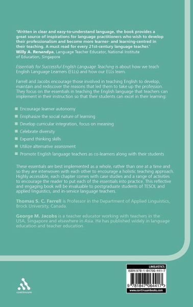 Essentials For Successful English Language Teaching is about how we teach English Language Learners (ELLs) and how our ELLs learn. Farrell and Jacobs encourage those involved in teaching English to develop, maintain and rediscover the reasons that led them to take up the profession. They focus on the essentials in teaching the English language that teachers can implement in their instruction so that their students can excel in their learning: Encourage learner autonomy Emphasize the social nature of learning Develop curricular integration, focus on meaning Celebrate diversity Expand thinking skills Utilize alternative assessment, and Promote English language teachers as co-learners along with their students. These essentials are best implemented as a whole, rather than one at a time and so they are interwoven with each other to encourage a holistic teaching approach. Highly accessible, each chapter comes with case studies and a range of activities to encourage the reader to put each of the essentials into practice. With these the authors aim to bring an inner smile to all English language teachers that reassures them they made the right choice when they chose to become teachers of the English language. This reflective and engaging book will be invaluable to postgraduate students of TESOL and applied linguistics, and in-service language teachers.