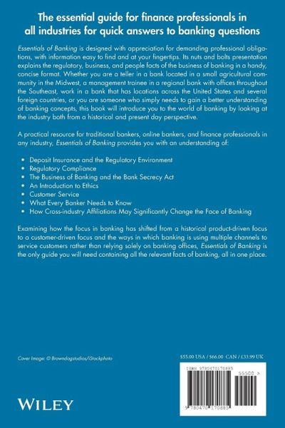The essential guide for finance professionals in allindustries for quick answers to banking questions Essentials of Banking is designed with appreciation for demanding professional obligations, with information easy to find and at your fingertips. Its nuts and bolts presentation explains the regulatory, business, and people facts of the business of banking in a handy, concise format. Whether you are a teller in a bank located in a small agricultural community in the Midwest, a management trainee in a regional bank with offices throughout the Southeast, work in a bank that has locations across the United States and several foreign countries, or you are someone who simply needs to gain a better understanding of banking concepts, this book will introduce you to the world of banking by looking at the industry both from a historical and present day perspective. A practical resource for traditional bankers, online bankers, and finance professionals in any industry, Essentials of Banking provides you with an understanding of: * Deposit Insurance and the Regulatory Environment * Regulatory Compliance * The Business of Banking and the Bank Secrecy Act * An Introduction to Ethics * Customer Service * What Every Banker Needs to Know * How Cross-industry Affiliations May Significantly Change the Face of Banking Examining how the focus in banking has shifted from a historical product-driven focus to a customer-driven focus and the ways in which banking is using multiple channels to service customers rather than relying solely on banking offices, Essentials of Banking is the only guide you will need containing all the relevant facts of banking, all in one place.