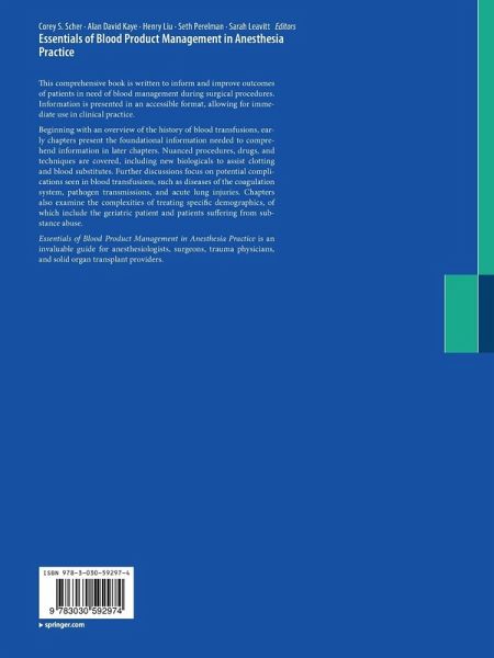 Chapter 1. The History of Blood Transfusions.- Chapter 2. Modern Blood Banking.- Chapter 3. Blood Component Therapy.- Chapter 4. The Coagulation System and Blood Clot Stability.- Chapter 5. Fibrinolysis, Antifibrinolytic Agents, and Perioperative Considerations.- Chapter 6. Hypercoagulation and Thrombotic Disorders.- Chapter 7. Diseases or Conditions of Platelet Disorders.- Chapter 8. Massive Transfusion Protocol.- Chapter 9. New Biologicals to Assist Clotting.- Chapter 10. Herbal Substances that Affect Hemostasis.- Chapter 11. Ultrasound for Bleeding Disorders.- Chapter 12. Complications of Blood Transfusions.- Chapter 13. Diseases of the Coagulation System: Hemophilia, Von Willebrands Disease, cryoglobulinemia, inborn errors of factor synthesis.- Chapter 14. Blood Conservation Strategies and Bloodless Medicine.- Chapter 15. When Blood is Not an Option.- Chapter 16. Blood Substitutes and Artificial Oxygen Carriers.- Chapter 17. Preoperative Therapy for Anemia.- Chapter 18. Blood Deployment in Natural Disasters and a Military in Conflict.- Chapter 19. Commonly Prescribed Medications that Affect Clotting: A Comprehensive Overview.- Chapter 20. Blood Transfusions in the Severe Trauma Patient.- Chapter 21. Point of Care Tests in for Blood Coagulation in the Perioperative Period.- Chapter 22. Vascular Endothelial Dysfunction and Inflammatory States.- Chapter 23. Obstetrical Blood Management.- Chapter 24. Pediatric Blood Management.- Chapter 25. Blood Management in the Liver Transplant Patient.- Chapter 26. Liberal vs. Conservative Blood Strategies.- Chapter 27.- Chapter 28. Metabolism, Pathophysiology, and Clinical Considerations of Iron Overload, a Comprehensive Review.- Chapter 29. Blood Transfusion Pitfalls.- Chapter 30. Blood and the Traumatic Brain Injury.- Chapter 31. Transfusion Related-Immunomodulation in Relation to Perioperative Infection/Cancer: Biology, Evidence, and Controversy in Transfusion.- Chapter 32. Origins of Blood Products.- Chapter 33. Blood Conservation and Management in Cardiac Surgery.- Chapter 34. Platelet Rich Plasma: Not for Athletes Only.- Chapter 35. Blood Transfusions for Burn Patients.- Chapter 36. Pre-hospital Transfusions by First Providers.- Chapter 37. Whole Blood is Back.- Chapter 38. Normal Saline: Not So Normal at All in the Bleeding Patient.- Chapter 39. Blood Management for the Geriatric Patient.- Chapter 40. Substance Abuse and Coagulopathy.- Chapter 41. The Effects of Perioperative Transfusion of Allogenic Blood Products of Cancer Recurrence.- Chapter 42. Perioperative Management of Polycythemia.- Chapter 43. Blood Management in the Premature Neonate.- Chapter 44. Coagulation and Regional Anesthesia - Chrissy Cherenfant and Uchenna Umeh.- Chapter 45. Iron Overload.- Chapter 46. Blood Product Management in Developing Countries.- Chapter 47. Considerations and Guidelines for use of Anticoagulants and Antithrombotics in Patients Undergoing Interventional Pain Management.- Chapter 48. The Red Blood Cell Storage Lesion: A Controversy of Biology versus Randomized Controlled Trials.