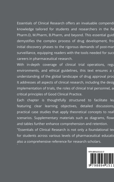 Welcome to "Essentials of Clinical Research-A comprehensive guide to drug development & Clinical Research," a comprehensive guide designed to illuminate the path through the complex landscape of clinical research. This book aims to serve as a cornerstone resource for students and professionals in the fields of Pharmacy (Pharm.D), Master of Pharmacy (M.Pharm), Bachelor of Pharmacy (B.Pharm), and those engaged in pharmaceutical research.The impetus for this book arises from a need for an integrative understanding of the myriad processes involved in the development of new drugs-from concept through to market. We recognize that while the journey of drug development is exhilarating, it is also riddled with challenges and intricacies that require a thorough grounding in clinical research principles. Each chapter of this book is carefully crafted to guide you through different phases of clinical research, including the design, implementation, regulation, and ethical considerations of clinical trials. Our approach is to provide not only the theoretical foundations but also practical insights and examples that draw on recent advancements and case studies from the field.