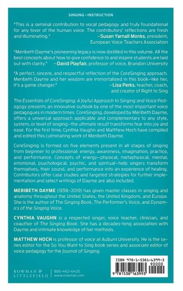 The Essentials of CoreSinging: A Joyful Approach to Singing and Voice Pedagogy presents an innovative outlook by one of the most important voice pedagogues in modern times. CoreSinging, developed by Meribeth Dayme, offers a universal approach applicable and complementary to any style, system, or level of singing-the ultimate result transforms fear into joy and ease. For the first time, Cynthia Vaughn and Matthew Hoch have compiled and edited this culminating work of Meribeth Dayme. CoreSinging is formed on five elements present in all stages of singing from beginner to professional: energy, awareness, imagination, practice, and performance. Concepts of energy-physical, metaphysical, mental, emotional, psychological, psychic, and spiritual-help singers transform themselves, their sound, and performance into an experience of healing. Contributors offer case studies and targeted strategies for further implementation and select writings of Dayme are also included.
