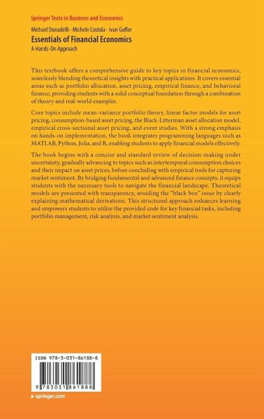 The book begins with a concise and standard review of decision-making under uncertainty, gradually advancing to topics such as intertemporal consumption choices and their impact on asset prices, before concluding with empirical tools for capturing market sentiment. By bridging fundamental and advanced finance concepts, it equips students with the necessary tools to navigate the financial landscape. Theoretical models are presented with transparency, avoiding the "black box" issue by clearly explaining mathematical derivations. This structured approach enhances learning and empowers students to utilize the provided code for key financial tasks, including portfolio management, risk analysis, and market sentiment analysis.