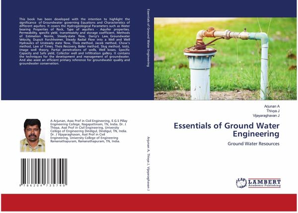 This book has been developed with the intention to highlight the significance of Groundwater governing Equations and Characteristics of different aquifers. It covers the Hydrogeological Parameters such as Water bearing Properties of Rock, Type of aquifers - Aquifer properties. Permeability, specific yield, transmissivity and storage coefficient, Methods of Estimation Norms, Steady-state flow, Darcy's Law, Groundwater Velocity, Dupuit Forchheimer, Steady Radial Flow into a Well and Well Hydraulics of Unsteady state flow, Theis method, Jacob method, Chow's method, Law of Times, Theis Recovery, Bailer method, Slug method, tests, Image well theory, Partial penetrations of wells, Well losses, Specific Capacity and Safe yield, Collector well and Infiltration gallery. It contains the techniques for the development and management of groundwater. And also assist an efficient primary reference for groundwater quality and groundwater conservation.