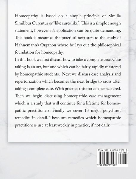 Homeopathy is based on a simple principle of Similia Similibus Curentur or "like cures like". This is a simple enough statement, however it's application can be quite demanding. This book is meant as the practical next step to the study of Hahnemann's Organon where he lays out the philosophical foundation for homeopathy. In this book we first discuss how to take a complete case. Case taking is an art, but one which can be fairly rapidly mastered by homeopathic students. Next we discuss case analysis and repertorization which becomes the next bridge to cross after taking a complete case. With practice this too can be mastered. Then we begin discussing homeopathic case management which is a study that will continue for a lifetime for homeopathic practitioners. Finally we cover 13 major polychrest remedies in detail. These are remedies which homeopathic practitioners use at least weekly in practice, if not daily. Learning these major polychrests is a solid foundation from which to begin the study of the rest of the homeopathic materia medica which is quite vast.