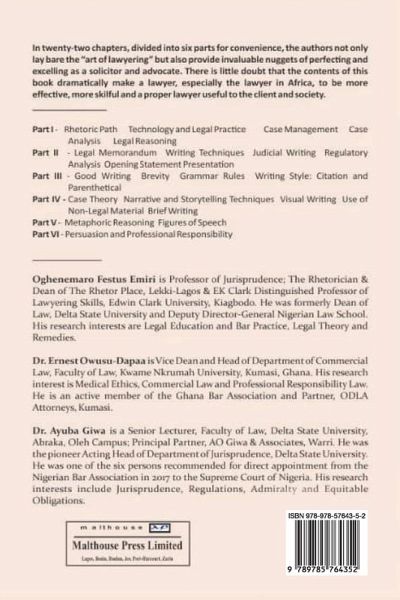 In twenty-two chapters, divided into six parts for convenience, the authors not only lay bare the "art of lawyering" but also provide invaluable nuggets of perfecting and excelling as a solicitor and advocate. There is little doubt that the contents of this book dramatically make a lawyer, especially the lawyer in Africa, to be more effective, more skilful and a proper lawyer useful to the client and society.