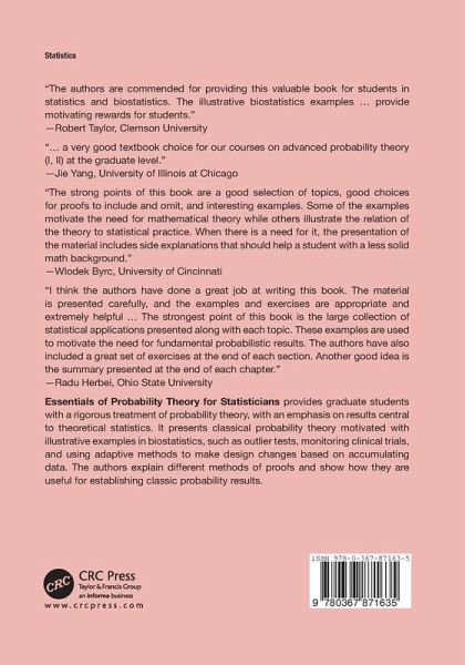Essentials of Probability Theory for Statisticians provides graduate students with a rigorous treatment of probability theory, with an emphasis on results central to theoretical statistics. It presents classical probability theory motivated with illustrative examples in biostatistics, such as outlier tests, monitoring clinical trials, and using adaptive methods to make design changes based on accumulating data. The authors explain different methods of proofs and show how they are useful for establishing classic probability results. After building a foundation in probability, the text intersperses examples that make seemingly esoteric mathematical constructs more intuitive. These examples elucidate essential elements in definitions and conditions in theorems. In addition, counterexamples further clarify nuances in meaning and expose common fallacies in logic. This text encourages students in statistics and biostatistics to think carefully about probability. It gives them the rigorous foundation necessary to provide valid proofs and avoid paradoxes and nonsensical conclusions.