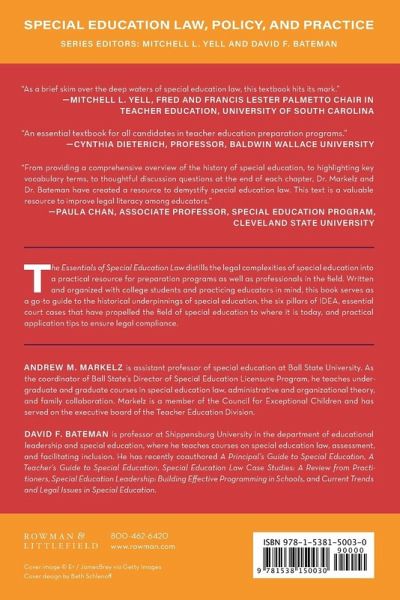The Essentials of Special Education Law is a valuable contribution to special education teacher preparation programs and professionals in the field. Written with undergraduates in mind, this accessible book is an ideal textbook supplement to any university course needing a greater emphasis on special education law.