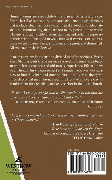 Human beings are made differently than all other creatures on Earth. Just like our bodies, our souls also have essential needs that include clean air, pure water, healthy food, and adequate shelter. Unfortunately, there are too many people in the world who are suffocating, dehydrating, starving, and suffering exposure in their spirits. The good news is that God wants us to live in a place where anxiety, fears, struggles, and regrets are eliminated. All we have to do is believe. In an inspirational presentation divided into four sections, Pastor Mark Stermer leads Christians on a survivalist journey to embrace an abundant existence and ultimately experience life in a new way. Through his encouragement and insight, believers will learn how to breathe clean and pure spiritual air, hydrate the spirit through biblical meditation, ingest the Holy Word every day as nourishment for the spirit, and seek shelter in the local church. "Essentials is a powerful tool to show us how to tap into the resources of the Holy Spirit to live abundantly!" -Dino Rizzo, Executive Director, Association of Related Churches "I highly recommend this book to all leaders wanting to live the life Christ intended." -Lee Domingue, author of Stay in Your Lane and Pearls of the King; founder of Kingdom Builders U.S., and CEO of GrowLeader
