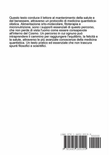 Questo testo conduce il lettore al mantenimento della salute e del benessere, attraverso un protocollo di medicina quantistica-olistica. Alimentazione orto-molecolare, fitoterapia e micronutrizione, sono i supporti essenziali di questo percorso, che non perde di vista l'uomo come essere consapevole all'interno del Cosmo. Un percorso in cui ognuno può intraprendere il cammino per raggiungere l'equilibrio, la felicità e la salute, attraverso le più avanzate conoscenze della medicina quantistica. Un testo pratico ed essenziale che non trascura spunti filosofici e scientifici.