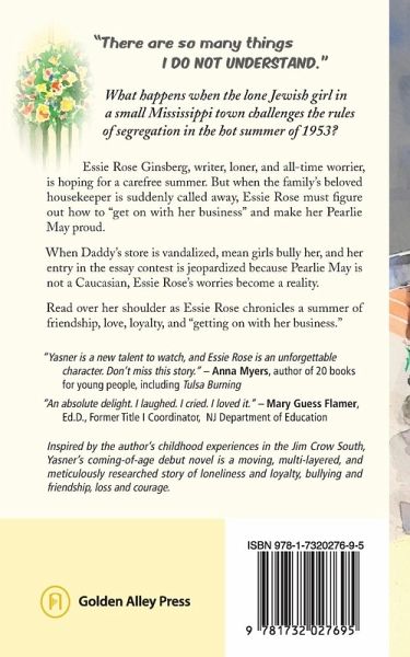 "There are so many things I DO NOT UNDERSTAND." What happens when the lone Jewish girl in a small Mississippi town challenges the rules of segregation in the hot summer of 1953? Essie Rose Ginsberg, writer, loner, and all-time worrier, is hoping for a carefree summer vacation. But when the family's beloved housekeeper is suddenly called away, Essie Rose must figure out how to "get on with her business" and make her Pearlie May proud. When Daddy's store is vandalized, when mean girls bully her, when her entry in the town's essay contest is jeopardized because Pearlie May is not a Caucasian, Essie Rose's worries become a reality. The Fourth of July comes and goes without Pearlie May's return. Will she make it home in time for Essie Rose's 11th birthday? Will the Ginsbergs remain in Tipton, or will increasing discrimination and danger finally force them to return up North? Read over her shoulder as Essie Rose captures it all in her Writer's Notebook, chronicling a summer of friendship, love, loyalty, and "getting on with her business." Inspired by the author's childhood experiences in the Jim Crow South, Yasner's coming-of-age debut novel is a moving, multi-layered, and meticulously-researched story of loneliness and loyalty, bullying and friendship, loss and courage. "A wonderful book...my congratulations on its publishing." - Jonathan Greenblatt, CEO and National Director, ADL "Yasner is a new talent to watch, and Essie Rose is an unforgettable character. Don't miss this story."- Anna Myers, author of 20 books for young people, including Tulsa Burning "An absolute delight. I laughed. I cried. I loved it."- Mary Guess Flamer, Ed.D., Former Title I Coordinator, NJ Department of Education