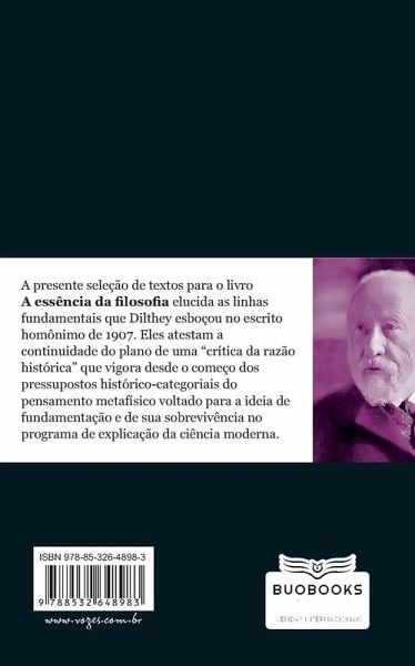 A presente seleção de textos para o livro A Essência da filosofia elucida as linhas fundamentais, que Dilthey esboçou no escrito homônimo de 1907, a partir de partes oriundas do volume 1 do Introdução às ciências humanas (1883) e de fragmentos póstumos dos anos de 1880 e 1889, que foram dedicados ao prosseguimento da obra capital sistemática. Eles atestam a continuidade do plano de uma "crítica da razão histórica".