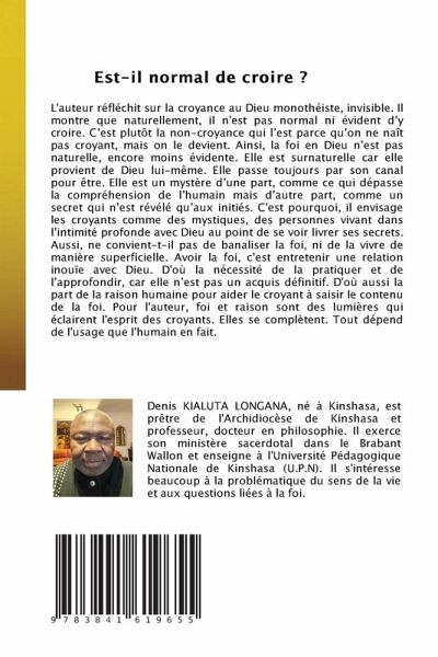 L'auteur réfléchit sur la croyance au Dieu monothéiste, invisible. Il montre que naturellement, il n'est pas normal ni évident d'y croire. C'est plutôt la non-croyance qui l'est parce qu'on ne naît pas croyant, mais on le devient. Ainsi, la foi en Dieu n'est pas naturelle, encore moins évidente. Elle est surnaturelle car elle provient de Dieu lui-même. Elle passe toujours par son canal pour être. Elle est un mystère d'une part, comme ce qui dépasse la compréhension de l'humain mais d'autre part, comme un secret qui n'est révélé qu'aux initiés. C'est pourquoi, il envisage les croyants comme des mystiques, des personnes vivant dans l'intimité profonde avec Dieu au point de se voir livrer ses secrets. Aussi, ne convient-t-il pas de banaliser la foi, ni de la vivre de manière superficielle. Avoir la foi, c'est entretenir une relation inouïe avec Dieu. D'où la nécessité de la pratiquer et de l'approfondir, car elle n'est pas un acquis définitif. D'où aussi la part de la raison humaine pour aider le croyant à saisir le contenu de la foi. Pour l'auteur, foi et raison sont des lumières qui éclairent l'esprit des croyants. Elles se complètent. Tout dépend de l'usage que l'humain en fait.