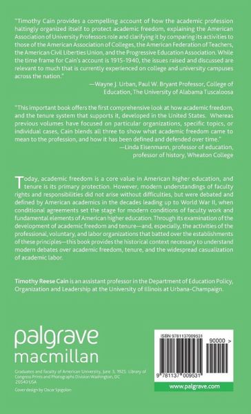 "Timothy Cain provides a compelling account of how the academic profession haltingly organized itself to protect academic freedom, explaining the AAUP's role and clarifying it by comparing its activities to those of the American Association of Colleges (AAC), the American Federation of Teachers (AFT), the American Civil Liberties Union (ACLU), and the Progressive Education Association (PEA). While the time frame for Cain's account is 1915-1940, the issues raised and discussed are relevant to much that is currently experienced on college and university campuses across the nation." - Wayne J. Urban,Paul W. Bryant Professor, College of Education, The University of Alabama Tuscaloosa