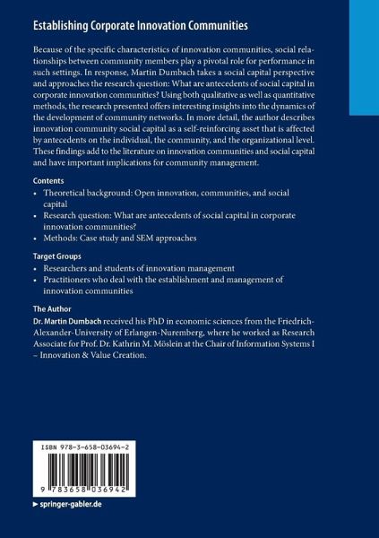 Because of the specific characteristics of innovation communities, social relationships between community members play a pivotal role for performance in such settings. In response, Martin Dumbach takes a social capital perspective and approaches the research question: What are antecedents of social capital in corporate innovation communities? Using both qualitative as well as quantitative methods, the research presented offers interesting insights into the dynamics of the development of community networks. In more detail, the author describes innovation community social capital as a self-reinforcing asset that is affected by antecedents on the individual, the community, and the organizational level. These findings add to the literature on innovation communities and social capital and have important implications for community management.