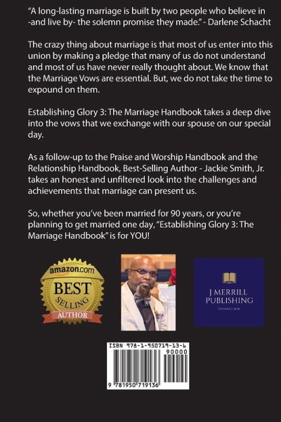 "A long-lasting marriage is built by two people who believe in -and live by- the solemn promise they made." - Darlene Schacht The crazy thing about marriage is that most of us enter into this union by making a pledge that many of us do not understand and most of us have never really thought about. We know that the Marriage Vows are essential. But, we do not take the time to expound on them. Establishing Glory 3: The Marriage Handbook takes a deep dive into the vows that we exchange with our spouse on our special day. As a follow-up to the Praise and Worship Handbook and the Relationship Handbook, Best-Selling Author - Jackie Smith, Jr. takes an honest and un¿ltered look into the challenges and achievements that marriage can present us. So, whether you've been married for 90 years, or you're planning to get married one day, "Establishing Glory 3: The Marriage Handbook" is for YOU!
