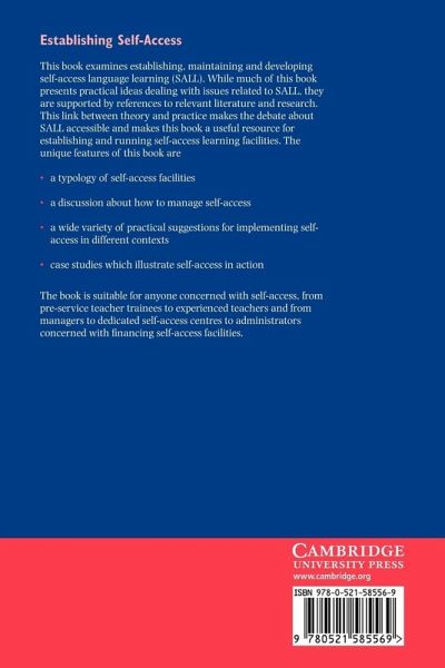 Establishing Self-Access examines establishing, maintaining and developing self-access language learning (SALL). While much of it presents practical ideas dealing with issues related to SALL, they are supported by references to relevant literature and research. This link between theory and practice makes the debate about SALL accessible and makes this a useful resource for establishing and running self-access learning facilities. Its unique features include a typology of self-access facilities; a discussion about how to manage self-access; a step by step guide on evaluating self-access; a wide variety of practical suggestions for implementing self-access in different contexts. It is suitable for anyone concerned with self-access, from pre-service teacher trainees to experienced teachers and from managers of dedicated self-access centres to administrators concerned with financing self-access facilities.