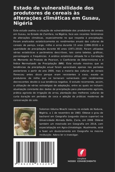 Este estudo avaliou a situação de vulnerabilidade dos produtores de cereais em Gusau, no Estado de Zamfara, na Nigéria, face aos recentes fenómenos de alterações climáticas, especialmente no que respeita à precipitação. Foram analisados estatisticamente os rendimentos anuais das culturas de cereais de painço, sorgo, milho e arroz durante 15 anos (1996-2010) e a quantidade de precipitação durante 40 anos (1971-2010). Foram utilizadas várias estatísticas e parâmetros descritivos, tais como tabelas, gráficos, percentagens e frequências. A análise estatística utilizada foi a Correlação do Momento do Produto de Pearson, o Coeficiente de Determinismo e o Índice Normalizado de Precipitação (NRI). Este estudo mostrou que as tendências da precipitação anual foram apreciáveis apenas nos períodos posteriores a partir do ano 2000, mas a maioria das culturas de cereais floresceu antes disso porque eram resistentes à seca, exceto os produtores de milho que se tornaram vulneráveis com rendimentos decrescentes devido à sua tendência negativa. O estudo recomenda, assim, a utilização de várias estratégias de adaptação, entre as quais se incluem: atualização constante dos dados de precipitação para planeamento agrícola, prática agrícola de irrigação do arroz, plantação das melhores culturas de curta duração em períodos de seca e adoção de práticas modernas de conservação do solo.