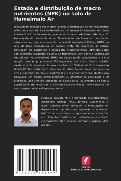 O estudo foi realizado sob o título "Estado e distribuição de macronutrientes (NPK) nos solos da área de Hamelmalo". O estudo foi efectuado em Zoba Anseba Sub Zoba Hamelmalo, que se situa na estrada Keren - Nakfa, a 12 km a norte da cidade de Keren. O estudo foi efectuado em dois locais adjacentes, ou seja, o campus do Hamelmalo Agricultural College (HAC) e a zona da bacia hidrográfica de Basheri (BWA). Os objectivos do estudo consistiam em determinar o estado dos macronutrientes (NPK) dos solos sob diferentes utilizações na zona de Hamelmalo, bem como a distribuição vertical dos macronutrientes (NPK) em alguns perfis selecionados e a sua relação com as propriedades físico-químicas dos solos. Foram colhidas aleatoriamente amostras de solo com base no Sistema de Posicionamento Global (GPS) em diferentes sistemas de utilização dos solos, ou seja, em áreas cultivadas (cereais e hortícolas) e em áreas florestais abertas não cultivadas. Em média, foram recolhidas 30 amostras de cada bloco e foi preparada uma amostra composta para cada bloco. As amostras de solo à superfície foram recolhidas a 0-20 cm de profundidade, num esquema de amostragem radial, utilizando um trado.
