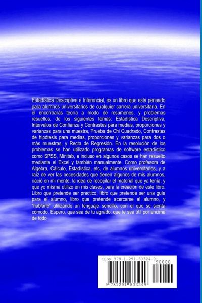 Estadística Descriptiva e Inferencial, es un libro que está pensado para alumnos universitarios de cualquier carrera universitaria. En él encontrarás teoría a modo de resúmenes, y problemas resueltos, de los siguientes temas: Estadística Descriptiva, Intervalos de Confianza y Contrastes de hipótesis para medias, proporciones y varianzas para una muestra, Prueba de Chi Cuadrado, Contrastes de hipótesis para medias, proporciones y varianzas para dos o más muestras, y Recta de Regresión. En la resolución de los problemas se han utilizado programas de software estadístico como SPSS, Minitab, e incluso en algunos casos se han resuelto mediante el Excel y también manualmente.