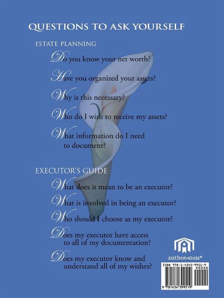 QUESTIONS TO ASK YOURSELF estate planning Do you know your net worth? Have you organized your assets? Why is this necessary? Who do I wish to receive my assets? What information do I need to document? EXECUTOR'S GUIDE What does it mean to be an executor? What is involved in being an executor? Who should I choose as my executor? Does my executor have access to all of my documentation? Does my executor know and understand all of my wishes?