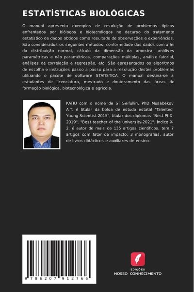 O manual apresenta exemplos de resolução de problemas típicos enfrentados por biólogos e biotecnólogos no decurso do tratamento estatístico de dados obtidos como resultado de observações e experiências. São considerados os seguintes métodos: conformidade dos dados com a lei da distribuição normal, cálculo da dimensão da amostra, análises paramétricas e não paramétricas, comparações múltiplas, análise fatorial, análises de correlação e regressão, etc. São apresentados os algoritmos de escolha e instruções passo a passo para a resolução destes problemas utilizando o pacote de software STATISTICA. O manual destina-se a estudantes de licenciatura, mestrado e doutoramento das áreas de formação biológica, biotecnológica e agrícola.
