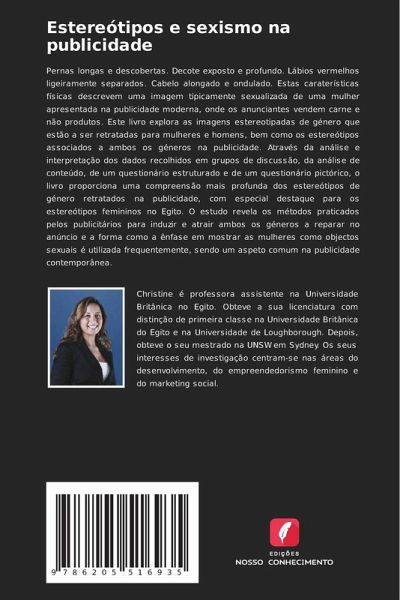Pernas longas e descobertas. Decote exposto e profundo. Lábios vermelhos ligeiramente separados. Cabelo alongado e ondulado. Estas caraterísticas físicas descrevem uma imagem tipicamente sexualizada de uma mulher apresentada na publicidade moderna, onde os anunciantes vendem carne e não produtos. Este livro explora as imagens estereotipadas de género que estão a ser retratadas para mulheres e homens, bem como os estereótipos associados a ambos os géneros na publicidade. Através da análise e interpretação dos dados recolhidos em grupos de discussão, da análise de conteúdo, de um questionário estruturado e de um questionário pictórico, o livro proporciona uma compreensão mais profunda dos estereótipos de género retratados na publicidade, com especial destaque para os estereótipos femininos no Egito. O estudo revela os métodos praticados pelos publicitários para induzir e atrair ambos os géneros a reparar no anúncio e a forma como a ênfase em mostrar as mulheres como objectos sexuais é utilizada frequentemente, sendo um aspeto comum na publicidade contemporânea.