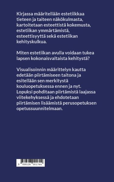 Kirjassa määritellään estetiikkaa tieteen ja taiteen näkökulmasta, kartoitetaan esteettistä kokemusta, estetiikan ymmärtämistä, esteettisyyttä sekä estetiikan kehityskulkua. Miten estetiikan avulla voidaan tukea lapsen kokonaisvaltaista kehitystä? Visualisoinnin määrittelyn kautta edetään piirtämiseen taitona ja esitellään sen merkitystä kouluopetuksessa ennen ja nyt. Lopuksi pohditaan piirtämistä laajassa viitekehyksessä ja ehdotetaan piirtämisen lisäämistä perusopetuksen opetussuunnitelmaan.