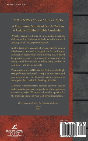 THE STORYTELLER COLLECTION A Captivating Storybook Set As Well As A Unique Children's Bible Curriculum Whether reading at home or in a classroom setting, children will be fascinated with the true-life stories of Esther, part of The Storyteller Collection. In this descriptive account of a young Jewish woman who becomes queen of the magnificent Persian Empire, each section begins with a short inspiring tale, followed by questions, answers, and complementary activities neatly suited for one child as well as many children to complete-and all in one book! Parents and teachers will likewise find the lessons refreshingly straightforward and simple-simple to understand and put into practice-not based on personal opinion or assumption, but chock-full of exciting biblical fact. Moreover, to implement the exercises, you won't need to make expensive purchases or spend a lot of time gathering excessive materials. What you will need is a passion for the truth and the use of your God-given imagination. Other books available in The Storyteller Collection Elijah Elisha
