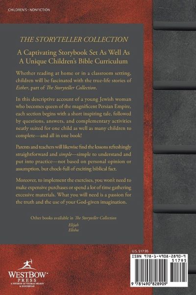 THE STORYTELLER COLLECTION A Captivating Storybook Set As Well As A Unique Children's Bible Curriculum Whether reading at home or in a classroom setting, children will be fascinated with the true-life stories of Esther, part of The Storyteller Collection. In this descriptive account of a young Jewish woman who becomes queen of the magnificent Persian Empire, each section begins with a short inspiring tale, followed by questions, answers, and complementary activities neatly suited for one child as well as many children to complete-and all in one book! Parents and teachers will likewise find the lessons refreshingly straightforward and simple-simple to understand and put into practice-not based on personal opinion or assumption, but chock-full of exciting biblical fact. Moreover, to implement the exercises, you won't need to make expensive purchases or spend a lot of time gathering excessive materials. What you will need is a passion for the truth and the use of your God-given imagination. Other books available in The Storyteller Collection Elijah Elisha